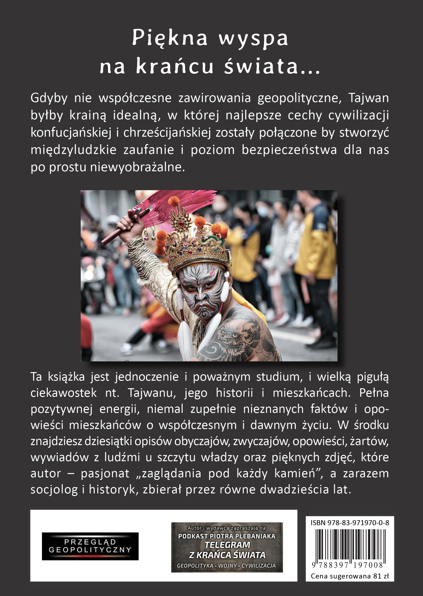 Praca przybliża również bogaty folklor, religijność oraz codzienne obyczaje mieszkańców, podkreślając odrębność tożsamości tajwańskiej od kontynentalnej. Całość uzupełniają praktyczne informacje dla podróżników oraz rozważania nad przyszłością wyspy w kontekście relacji z Chinami.